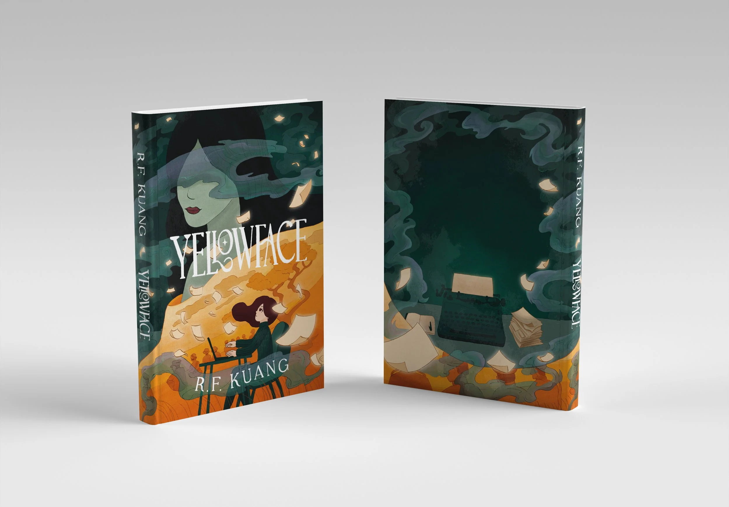 R.F. Kuang's bestseller "Yellowface" follows a young author, June Hayward who steals a manuscript from her late friend, Athena Liu and publishes Athena's story as her own. This book cover takes on a more sinister interpretation of how Athena's ghost continues to haunt June as she continues to use Athena's work as her muse throughout her writing career.